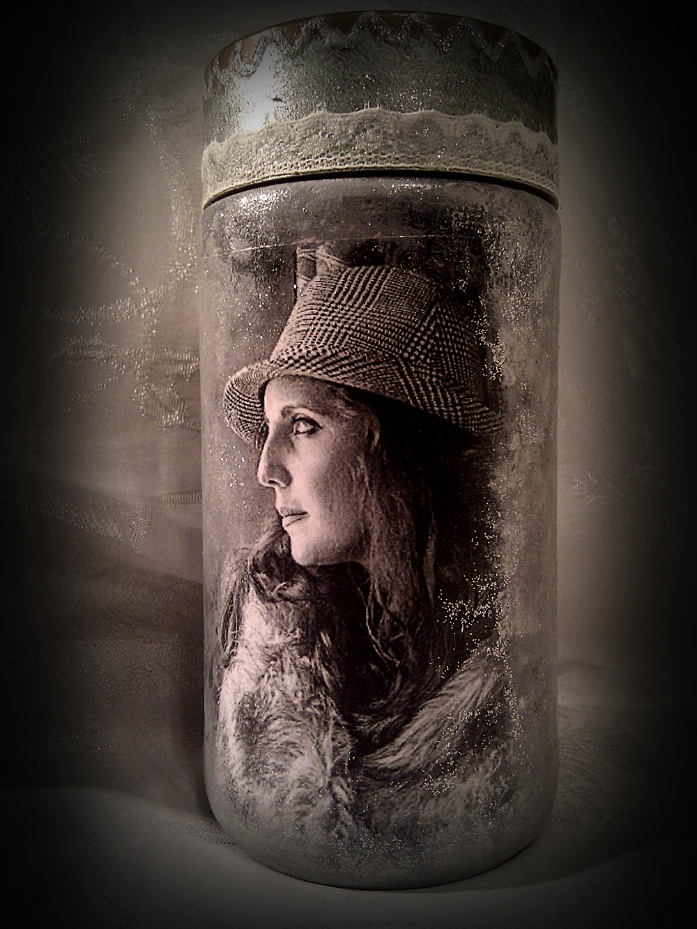 Opis obrazka: Ten sam słoik, druga jego strona. Zdjęcie czy dowolny obrazek trzeba wydrzeć (ja tego nie zrobiłam), aby uniknąć widoku odciętej krawędzi kartki. Wydarty obrazek łatwiej jest wkomponować w tło powierzchni. Efekt będzie naturalny i przez to ciekawszy.